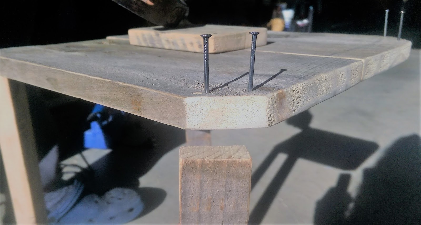 Está na hora de começar a pregar tudo, as bases devem ser bem pregadas às tábuas de altura com dois pregos.